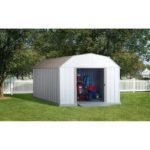 The barn style Lexington 10’x14′ steel storage building is an exceptional storage value. Give your tools a spacious home with a tremendous 852 cubic ft. of space. The gambrel style roof design means a peak height of over 7 ft. for extra head room and work area. Large pad lockable sliding doors open to allow easy storage of most riding mowers and other large equipment. Parts are pre-cut and pre-drilled for a faster assembly. Durable galvanized steel parts will mean a long lasting home  and organized space for your lawn tools, garden equipment, patio furniture , sporting gear and  more. The Lexington is backed by a 12 year limited warranty.