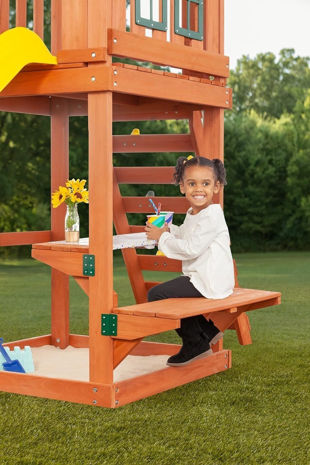 Designed for small backyards, the Cedar Cottage complete wooden playset by Creative Cedar Designs only takes up a 13.5 ft wide x 11.5 ft deep footprint in your backyard. Inspired by a cute country cottage, this wooden playset features charming details like a windowpane lookout to welcome visitors from the 4 ft. tower. The tarp roof and awning cover the tower as well as shade the picnic table down below for a cool, comfortable tea party or picnic. Create sandcastles galore beneath the tower, and steer a racecar or ship with the heavy-duty steering wheel up above! Jet down the 8 ft. slide to feel the wind in your hair, and race one another on the swings. Flip like a circus performer on the trapeze and scale the rock climbing wall like an explorer. The Cedar Cottage Wooden Playset includes all wood, hardware, accessories, and instructions necessary for assembly.