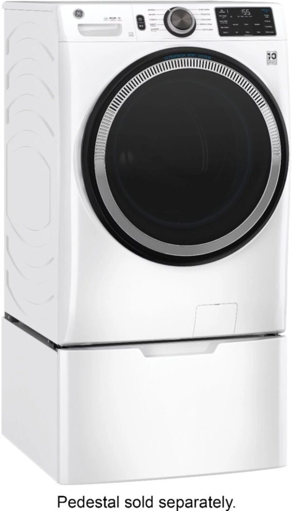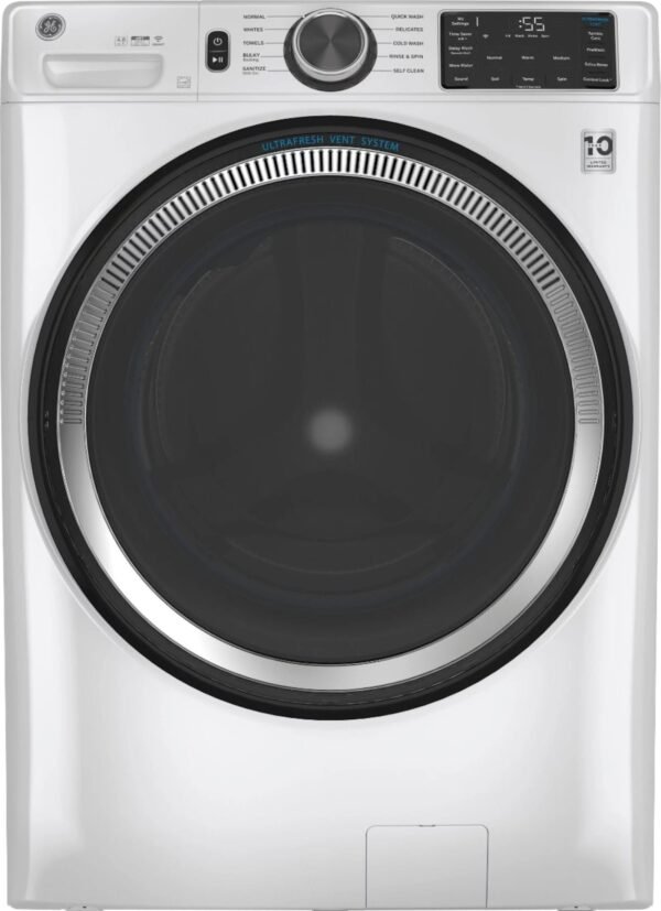 Home WASHERS GE – 4.8 CuFt High-Efficiency Stackable Smart Front Load Washer w/UltraFresh Vent System & Microban Antimicrobial Technology – White on white