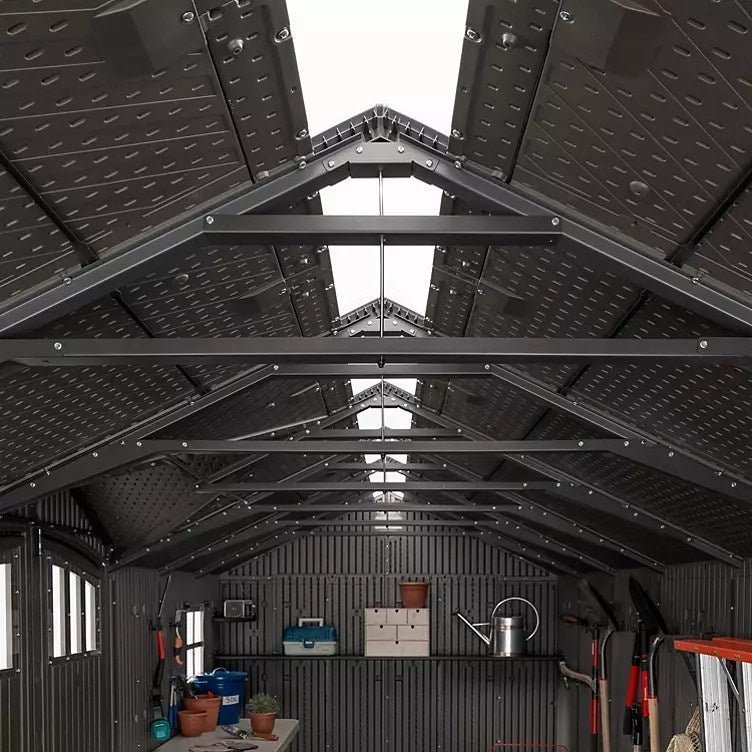 - Welcome to the next generation of Lifetime storage sheds! Introducing the Lifetime 15×8 dual entry shed with the great looking wood textured rough cut design. With all the superior materials and qualities Lifetime sheds are known for, this shed will be sure to serve you for many years. This building is constructed with dual-wall high-density polyethylene (HDPE) panels combined with five heavy duty Steel A-frame trusses to give it unmatched stregnth against the toughest elements. Panels are UV protected to give you unfading great looks and protect from cracking. The shed is stain resistant and never needs painting! Your no maintenance storage solution. Inside you’ll find high impact plastic flooring with hardwood texture looks. The floor is resistant to oil and other stains and is textured for prevent slips and falls (foundation of concrete or wood decking required). You’ll be able to get organized the first day with the included shelving and wall hooks. Natural lighting from 6 included skylights, 2 windows and transom windows on the doors will help you see clearly while working inside. Two screened vents above each gable end provides fresh air and ventilation while keeping pests out. Two swing open doors give you easy access to your stored items. Doors are pad lockable for security (pad locks not included). This extra large shed is a great option for storing riding mowers, atv’s, motorcycles, bicycles, kayaks, toys and more! You’re search is over, if this shed meets your needs and budget you are in the right place!